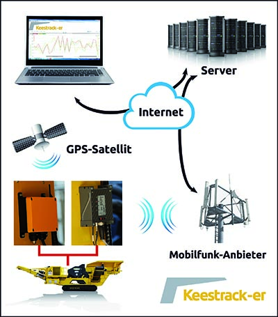 The Keestrack-er telematic system was introduced as an option on the latest generation of Keestrack screeners and crushers two years ago. Key components are a GSM/UMTS modem and a combined GSM/GPS antenna, which are linked through CAN bus to the machines’ main control unit. Real-time performance values (engine/drive speeds, hydraulic pressures, crusher settings, etc.), stored data and the machine’s accurate position are transmitted via GSM network and the local GSM provider’s internet access to the central Keestrack server. The information memorized and administered on this server can now be safely and reliably retrieved at any time and from everywhere worldwide. The interactive structure of Keestrack-er also allows direct access on the machine’s PLC-controller to fix or update the plant software.
